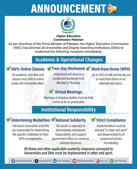 Along with the move to online education, HEC has also directed universities to adopt a four-day workweek, from Monday to Thursday. This change is designed to reduce operational costs. Furthermore, universities should allow up to 50% of their staff and faculty to work from home on alternate days to help manage resources better.